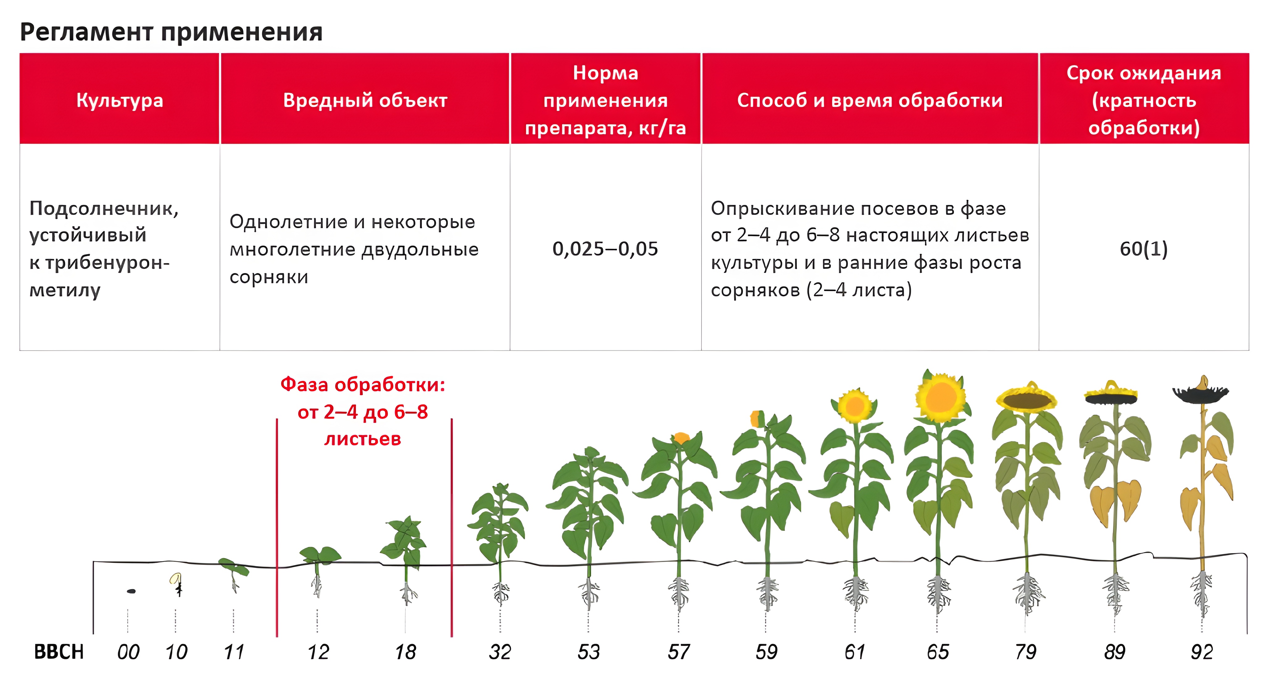 Гербициды на основе трибенурон-метила подходят для борьбы с двудольными сорняками и применяются в фазе от первой пары листьев подсолнечника до восьмого листа. Норма расхода — от 25 до 50 г/га.