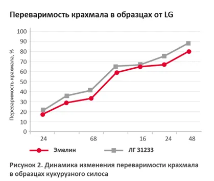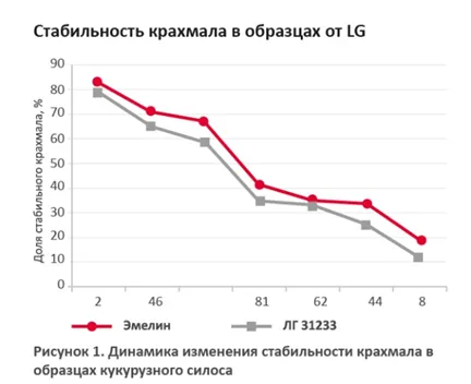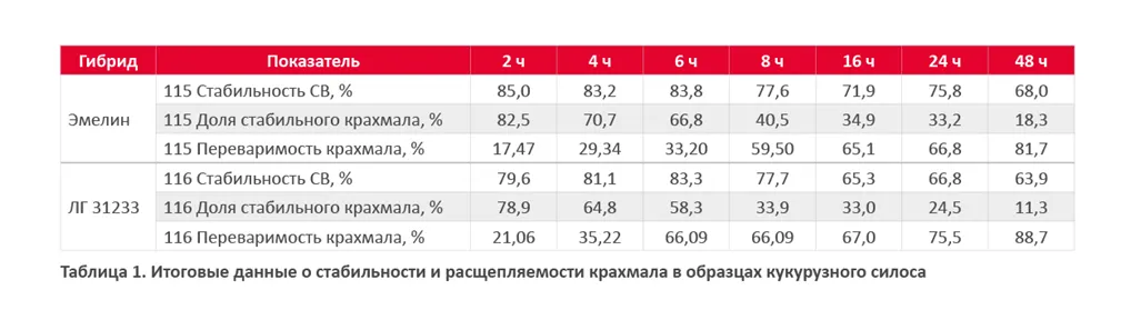 Согласно некоторым данным лаборатории Dairy One (США), ресурсу Feed Composition Library, типичная расщепляемость/разлагаемость крахмала в силосе кукурузном — 51,14–89,05 % (среднее — 69,5 %; данные получены после проверки 232 590 образцов). Представленные образцы силоса кукурузного имеют референсную стабильность крахмала. Наибольшая стабильность крахмала у образца № 115. Стабильность крахмала в образце № 116 меньше на 6,0 процентного пункта.