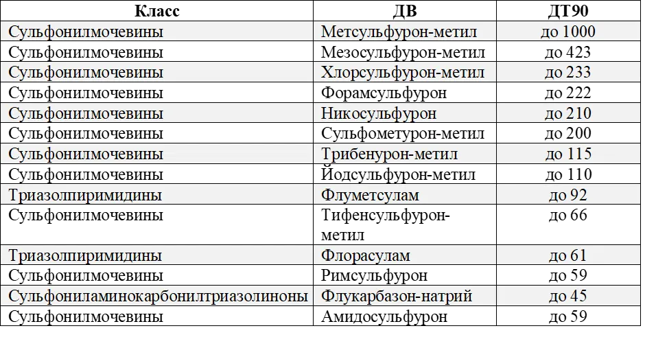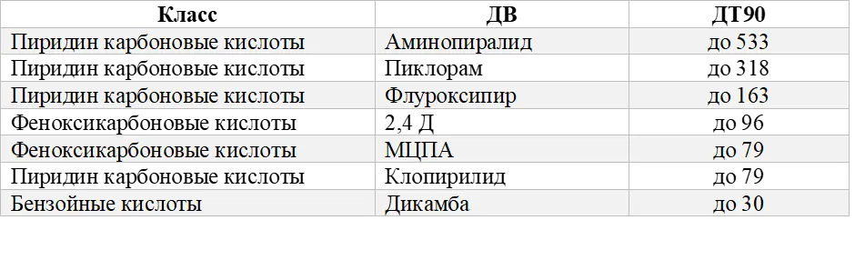 Ниже представлена таблица, в которой указано время, необходимое для разложения в почве действующих веществ после их внесения на предшествующих культурах. Спустя это время риски последействия должны минимизироваться. Однако, как показывает наш опыт с пироксуламом, официальные данные не всегда совпадают с реальной практикой. В производственных условиях мы можем наблюдать иные результаты. Этот факт подтверждает необходимость глубокого анализа и учета факторов, влияющих на разложение гербицидов.