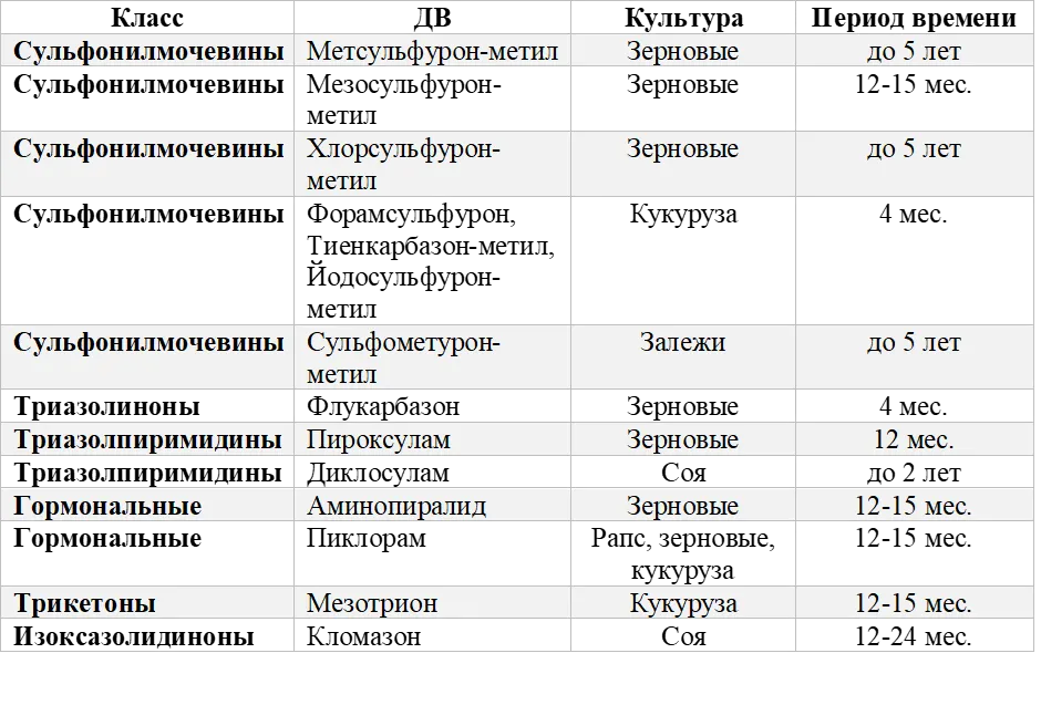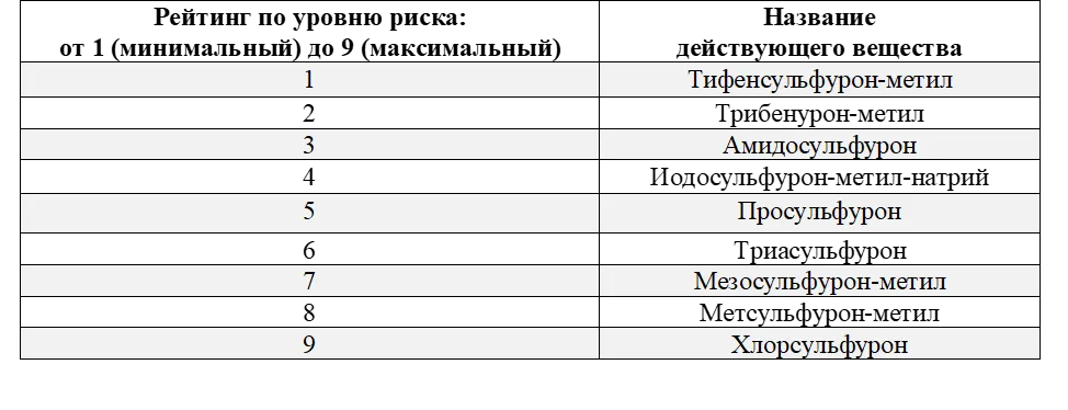 Таблица 1. Оценка сульфонилмочевинных гербицидов по риску последействия в севообороте